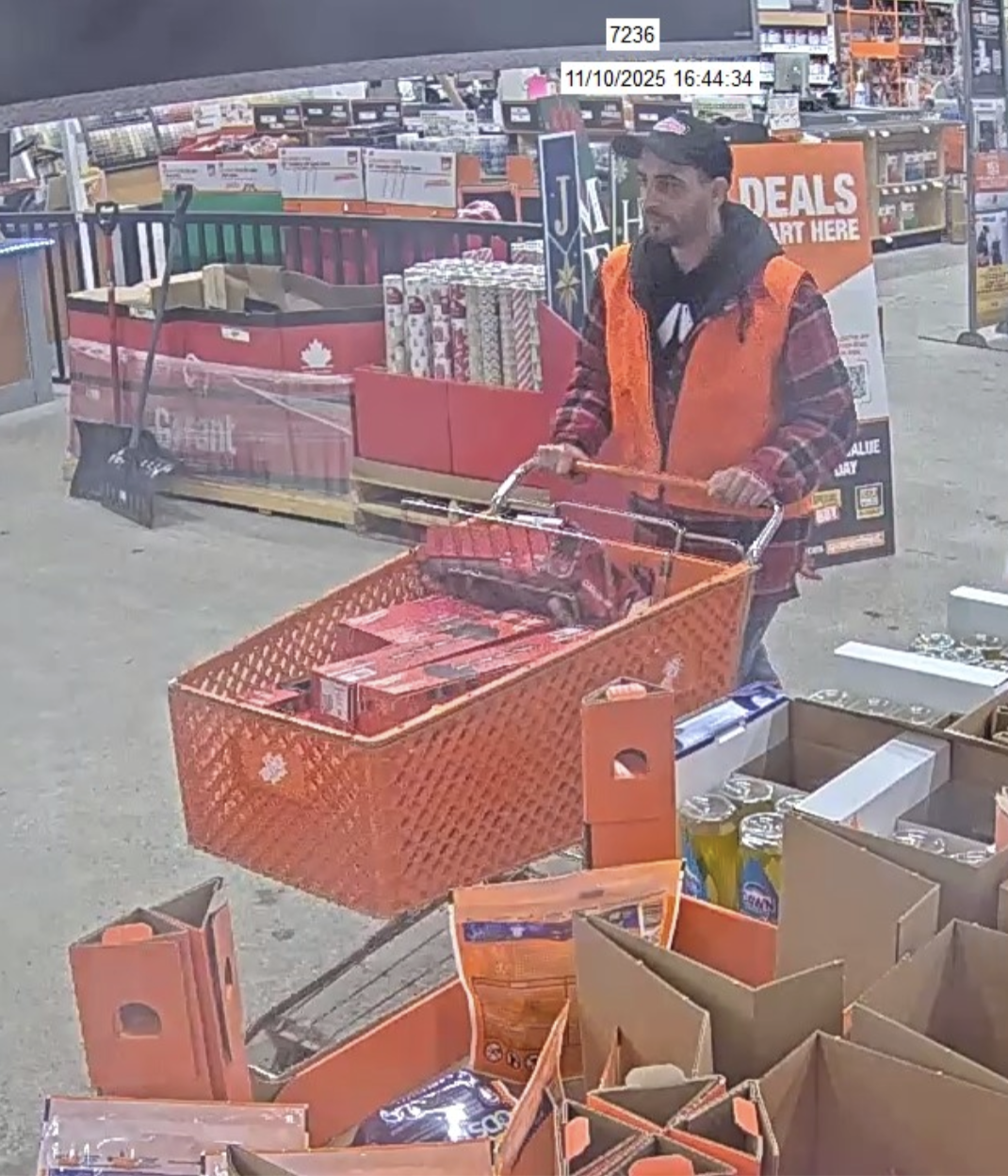 On November 19th, 2025, at approximately 4:45 p.m., a man was seen on CCTV in the tool section of Home Depot, Timmins, loading a shopping cart with Milwaukee tools and accessories and then pushing the cart out past all points of sale, making no attempt to pay.
