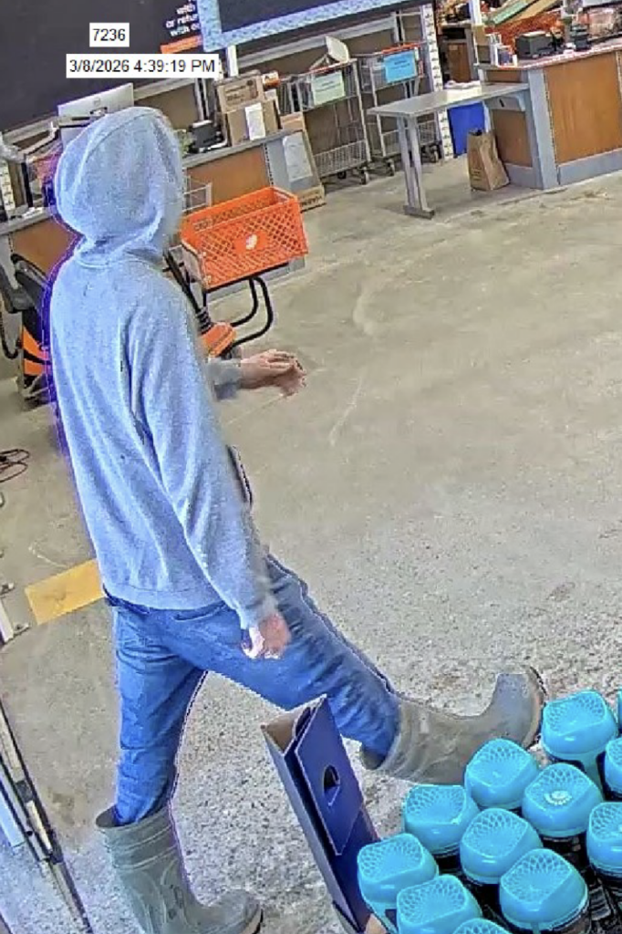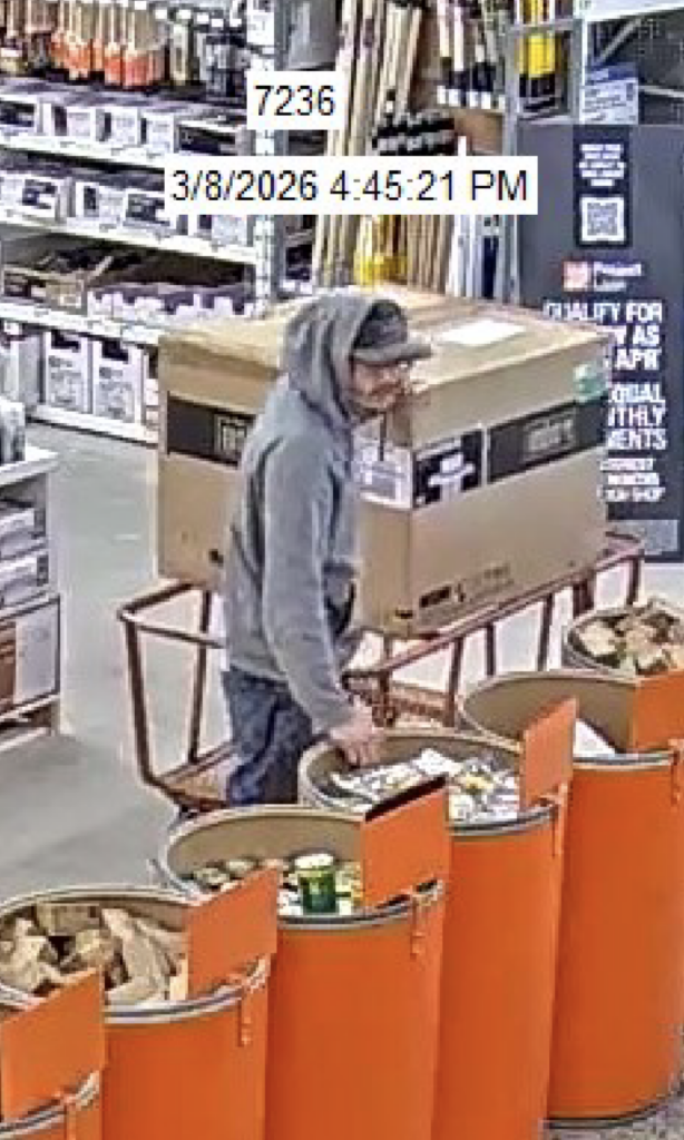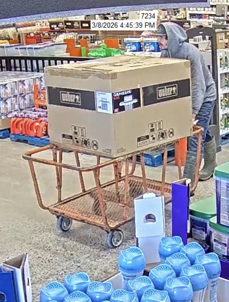 On Sunday, March 8th, 2025 at approximately 4:39 in the afternoon a man was seen on CCTV camera entering Home Depot, Timmins empty handed but at 4:45 is seen leaving the store pushing a flat cart with a WEBER BBQ valued at $1,199.00 He passed all points of sale making no attempt to pay.